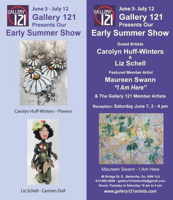 Please join the eclectic members of Gallery 121, to view a display of our innovative and interesting artwork. We are presently joined by Carolyn Huff-Winters & Liz Schell. The featured artist of this show is Maureen Swann.